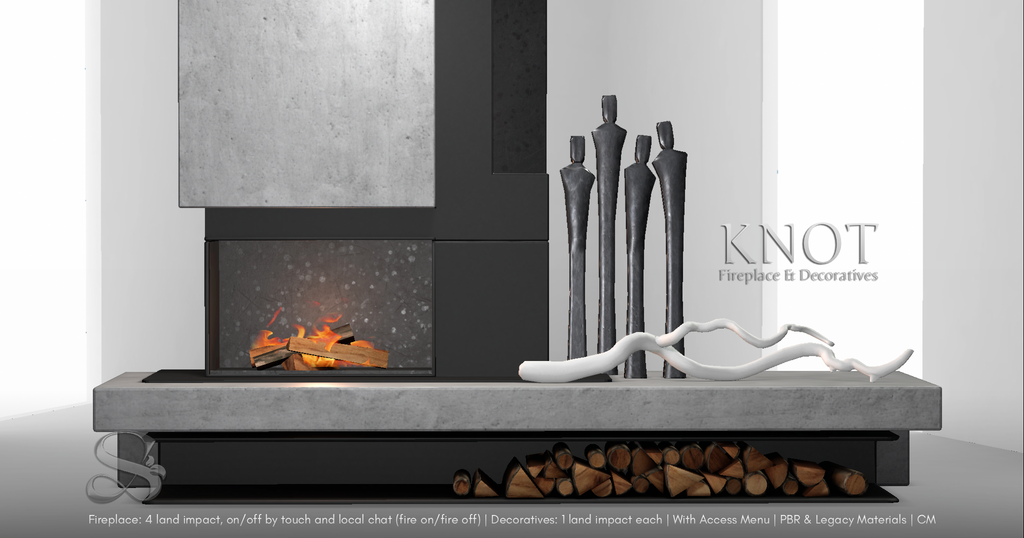 KNOT SPECS: Fireplace: 4 land impact | on/off by touch or local chat: “fire on” or “fire off” (without quotation marks) with access menu | Figures & Branch: 1 land impact each | PBR & Legacy Materials | CM