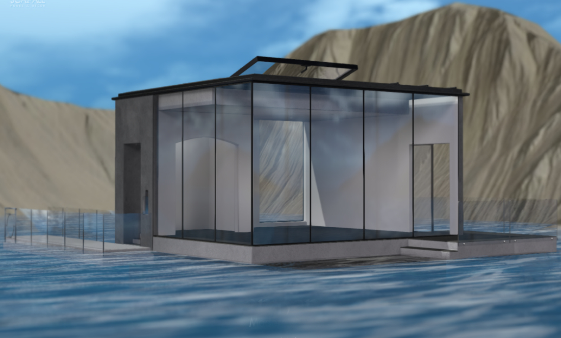 Studio built to stand on water, with intimate entryway, deck and optional bridge.