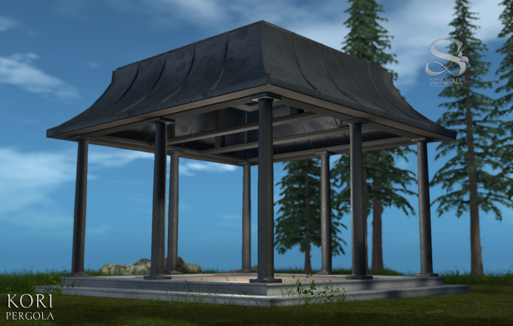 A minimalist, meditative, open pergola with three slender pillars on each side.