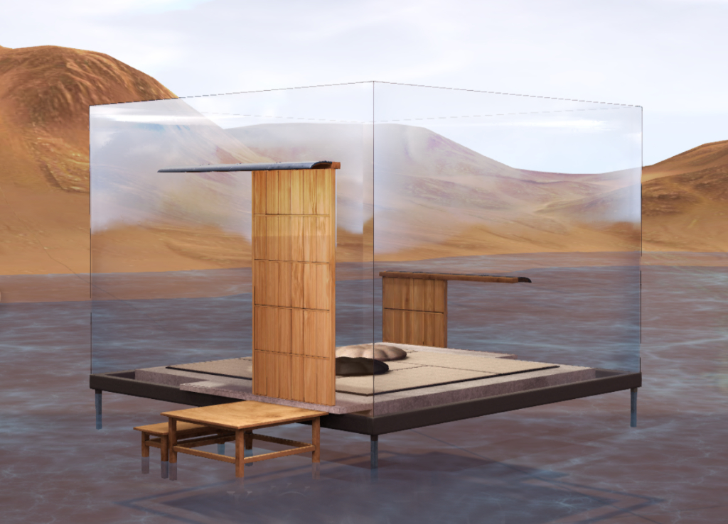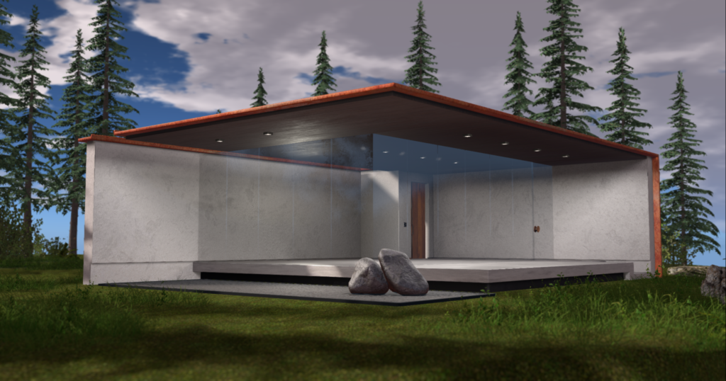 Brutalist, minimal studio with generous corten-steel shell, door alcove and expansive overhanging ceilings. Optional boulders and black sand.